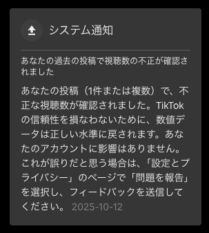 購入から数時間後、確かに再生回数は急増しました。しかし、その2日後にTikTokアプリを開くと、運営からの「通知」が届いていました。