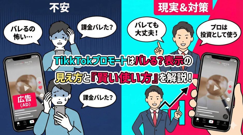 TikTokの公式広告機能である「プロモート」。数百円から手軽に再生回数をブーストできる便利な機能ですが、一番の懸念点は「他人にバレるかどうか」ではないでしょうか。